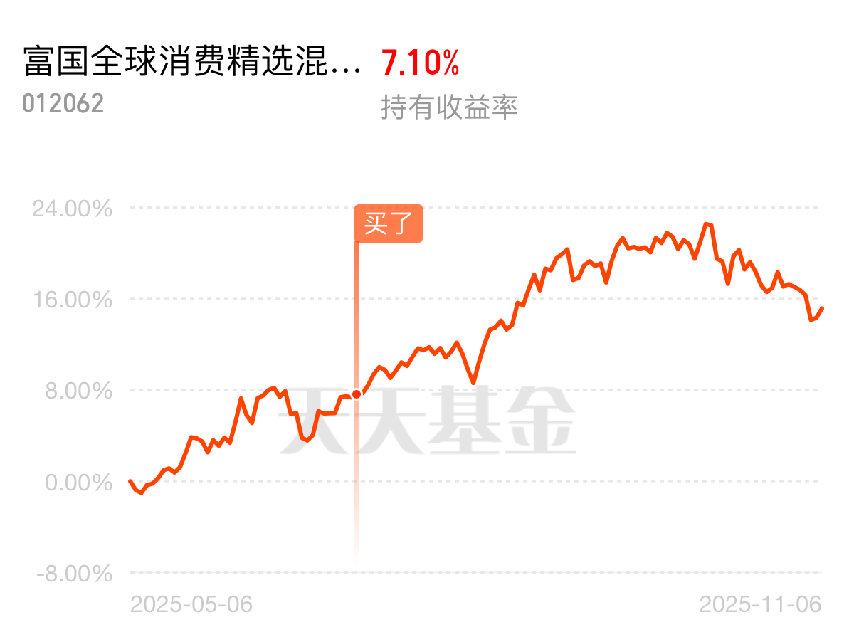 今天权益市场调整不用愁!消费板块直接迎风涨,政策还在全力扶消费,行情妥妥往上走。富国全球消费精选混合 太亮眼,今天估值涨了 1.48% 左右,家电、新消费都布局到了,赛道选得准。现在加仓正好赶上这波消费行情,不用追高还能摊薄成本,跟着优质基金喝口汤,后续上涨潜力满满,果断入手不犹豫!