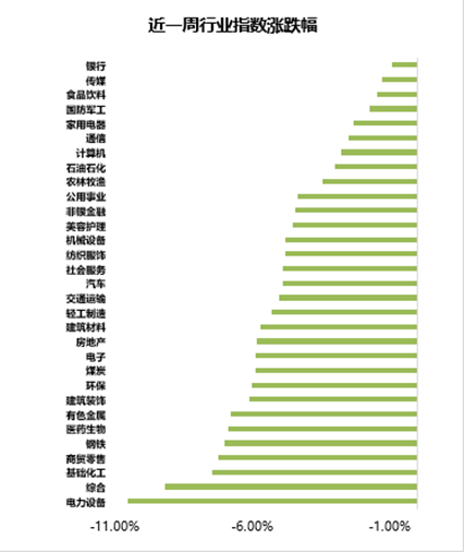 l 过去一周(2025.11.17-2025.11.21),主要宽基指数均回调。上证指数回调3.90%,创业板指回调6.15%,沪深300回调3.77%,中证500回调5.78%,中证1000回调5.80%,科创50回调5.54%。风格上,各风格指数也均回调,其中周期(-6.02%)风格领跌。从申万一级行业看,上周行业均调整,其中领跌的行业有电力设备(-10.54%)、综合(-9.18%)、基础化工(-7.47%)。