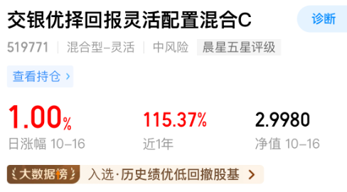 我加仓$交银优择回报灵活配置混合C(OTCFUND|519771)$1000元,优择这两天表现不错,前天大涨2.96%,昨天又涨了1%,比科技多个指数涨的都要好,经理选股眼光真不错,不愧是晨星5星评级!这波震荡调整下来近3个月依然涨超59%、今年以来涨超110%,A类位居同类排名第1、并入选4433选基榜,C类同类排名第2、入选历史绩优低回撤股基!
