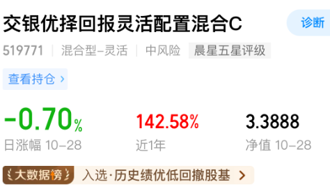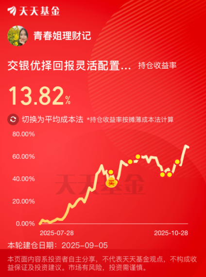我加仓$交银优择回报灵活配置混合C(OTCFUND|519771)$ 1000元,优择涨起来真猛,近3个月就涨了68.29%、近6个月涨超135%,太强了!这周又创出历史新高了,好在中旬左右出现调整的时候我勇于低吸了几笔,目前已盈利接近14%,今天盘中净值估算继续飘红,我继续定投一笔。