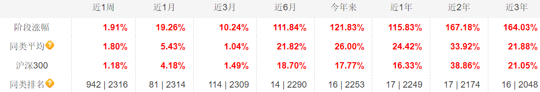 近3年、近2年、近1年、近6月、今年来,收益率均超100%,市场排名均处前20,综合表现超过99%的同类产品。