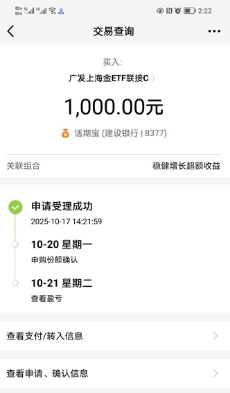 1.黄金方向:我今天新建仓$广发上海金ETF联接C(OTCFUND|008987)$1000元。这支基金是上海金的ETF联接基金。近几年来,国际黄金表现稳定且优秀,本基金近3年涨126.06%,近2年涨98.28%,近1年涨56.19%,近6月涨23.68%,近3月涨24.98%,近1月涨15.25%,近1周涨6.11%,短中长各时间周期都保持线性上涨,甚至可以比肩很多科技成长权益类基金。任何时候进场耐心持有一段时间,都能够获得不错的收益。若能够安心中长期持有,收益率估计能够轻松跑赢绝大部份投资者。很多投资者都知道黄金香,关键就畏高,怕自己一进去就开始回调。其实不懂才是我们恐惧的根源,当你懂了黄金上涨的核心逻辑,你就会明白,真正的上涨才刚刚开始。我简单分享黄金上涨的三点核心逻辑,一是全球大放水,二是国际关系越来越紧张,三是比特币也不再是安全避风港。我看好黄金接下来的表现,今天大胆建仓本基金。下面我晒一下买入操作记录: