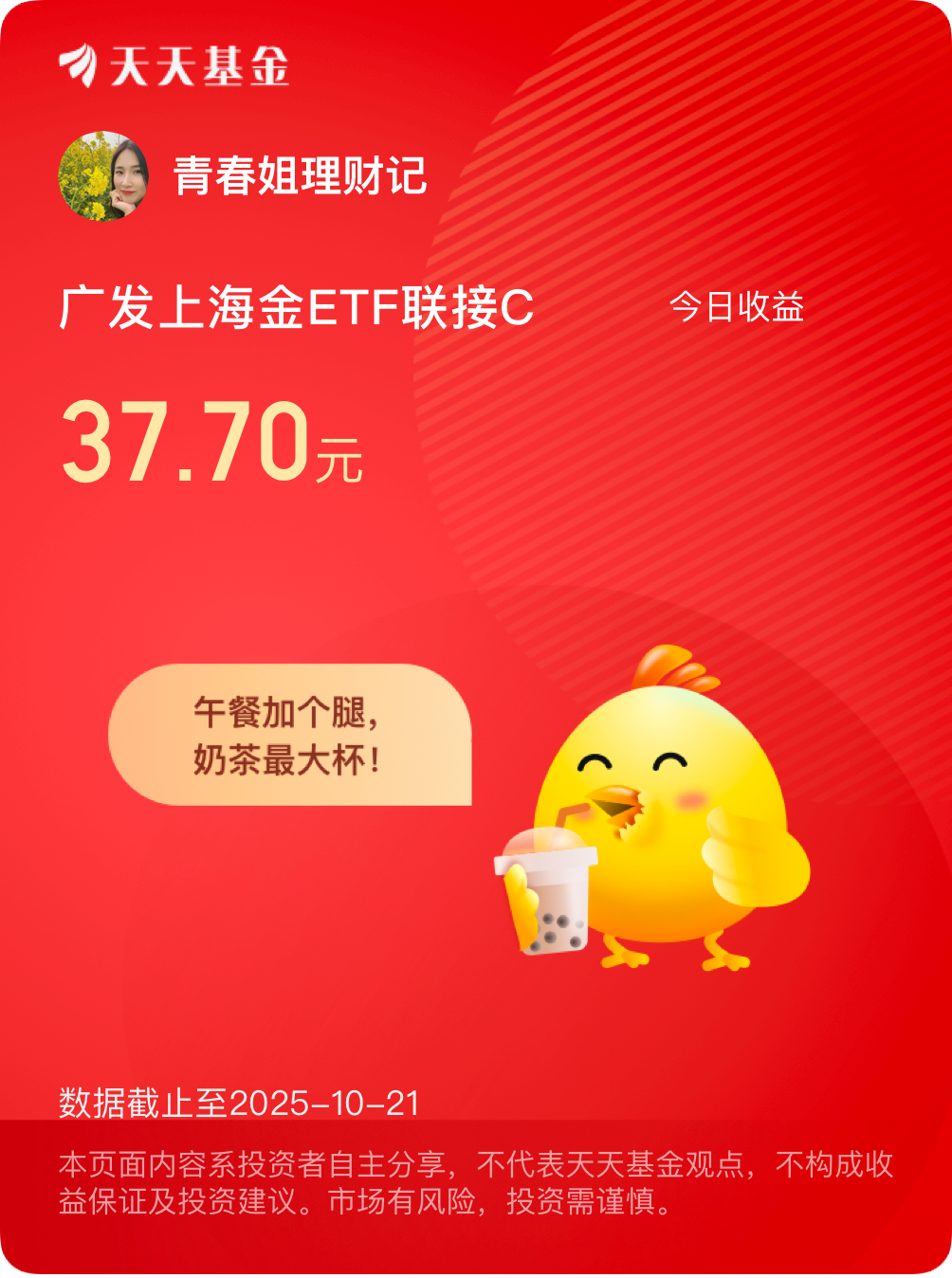 哇!没想到涨了1.91%,$广发上海金ETF联接C$ 今天吃肉啦!坐等下次突破千元! #晒收益#