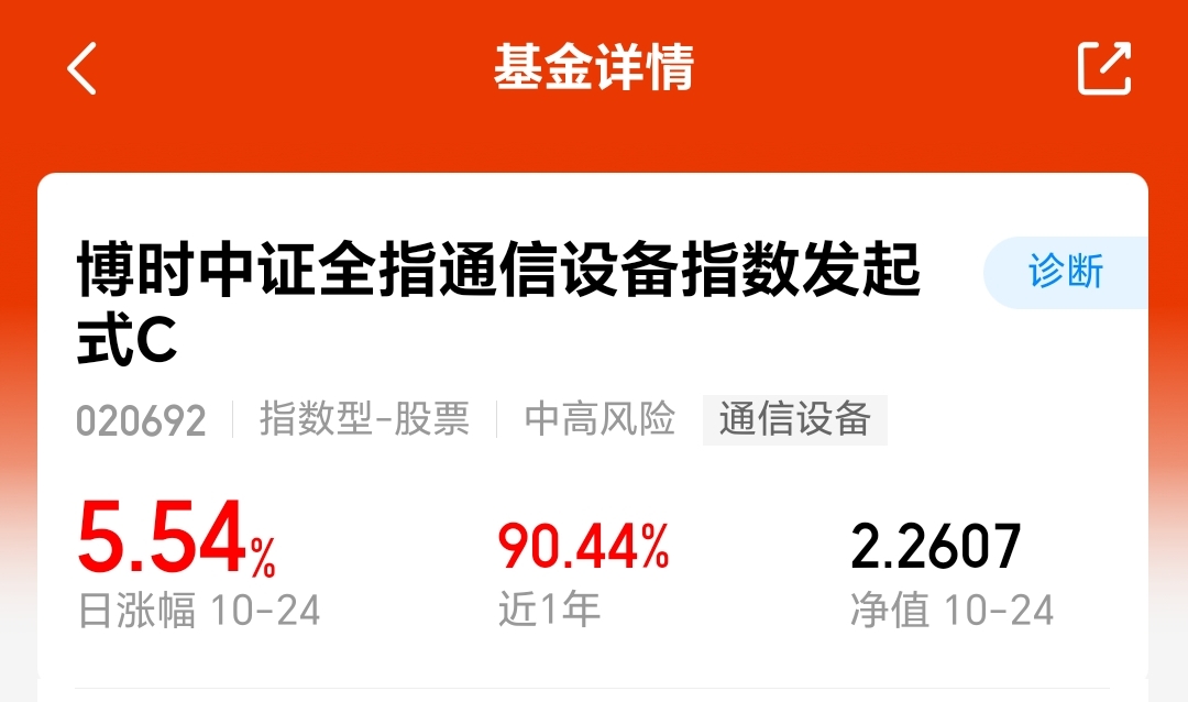 这个基金紧密跟踪中证全指通信设备指数,涵盖5G、光通信、卫星通信等多个关键子行业的优质企业,近1年收涨90.44%,还是很棒的。AI算力、卫星互联网这些大趋势我认为长期仍有较大的上涨空间,今天我先上车占位跟踪一下,后续再分批定投提高仓位,这个主线行情我就不错过了。