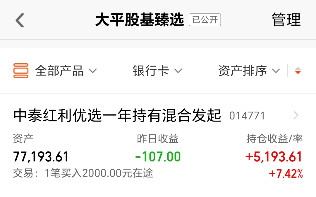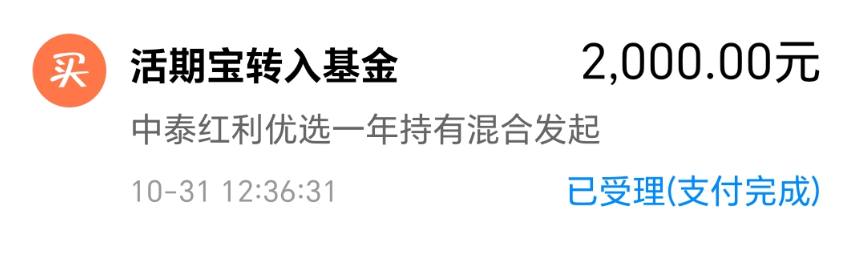 今天我买入$中泰红利优选一年持有混合发起(OTCFUND|014771)$2000块钱。