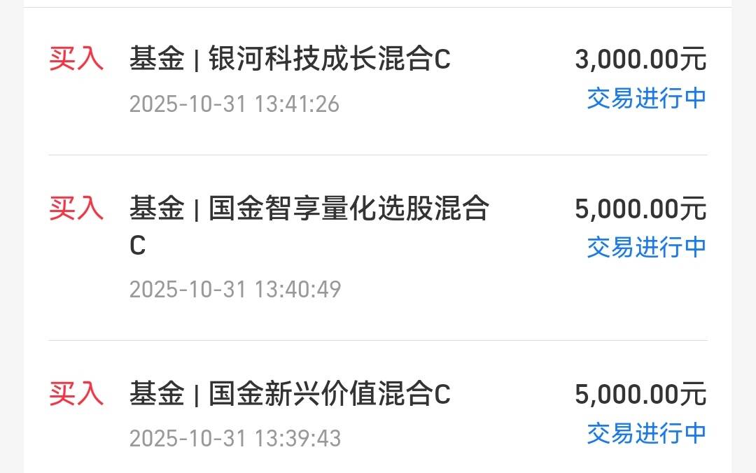 我今天加仓了黄金、银河创新成长、交银荣鑫灵活配置、银河科技成长、国金智享量化、恒生互联网科技、国金新兴价值,其它基金继续持有待涨。