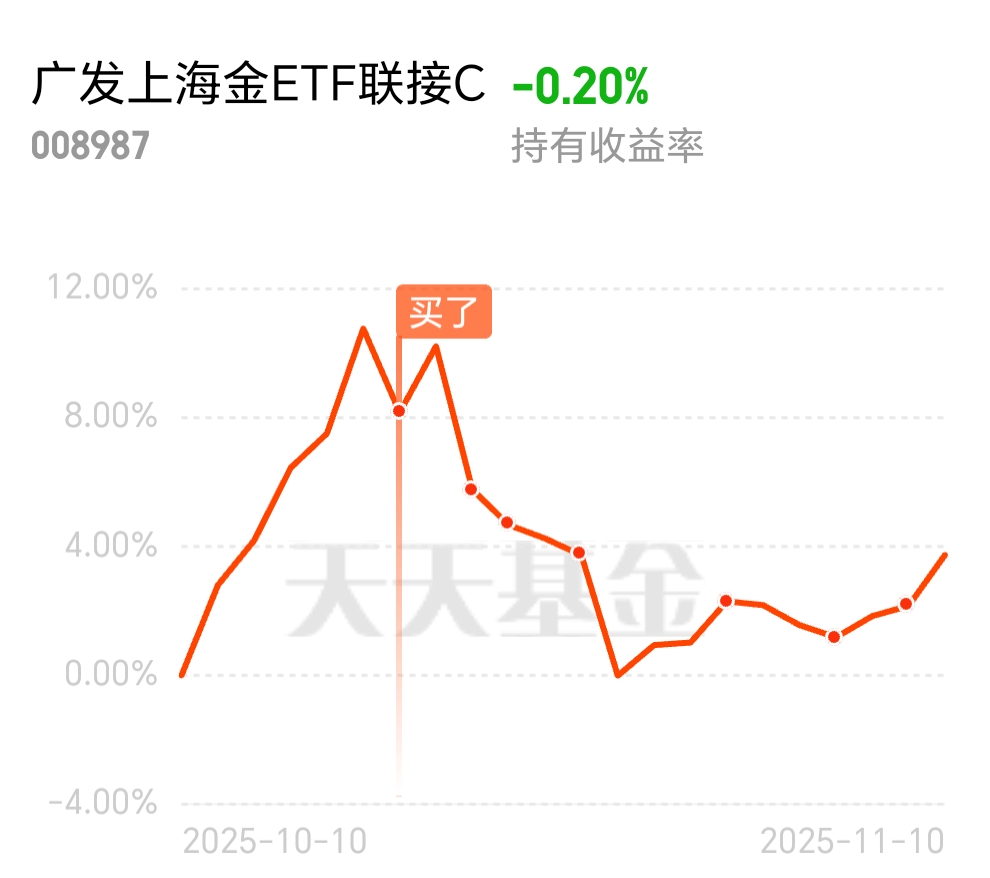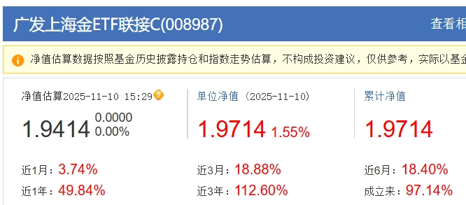 我持仓的$广发上海金ETF联接C$ 收涨1.55%,它今天3连涨了,它近1个月涨3.74,近3个月涨18.88%,近6个月涨18.4%,近1年涨49.84%,近3年涨112.60%,这个收益率还很给力的。