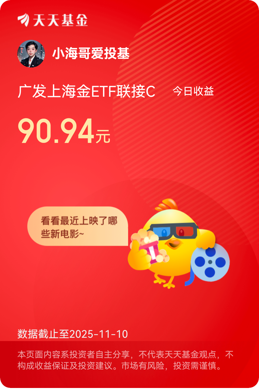 我持有的$广发上海金ETF联接C$ (008987)今晚更新净值上涨1.55%,近一年上涨超49%,整体表现还是很不错的,接下来我还会看情况哪些筹码。