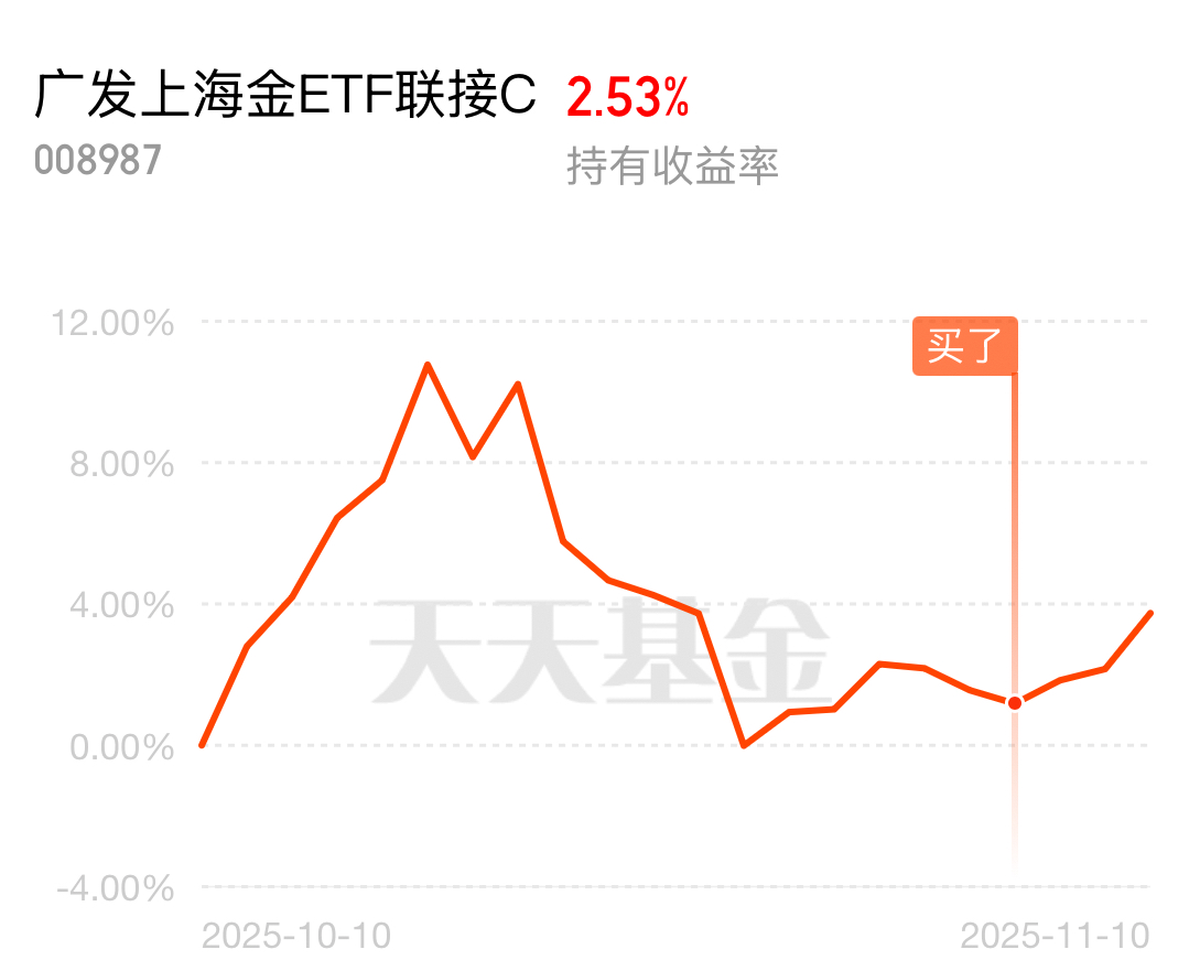 昨日黄金表现火热,我布局的$广发上海金ETF联接C$ 直接大涨1.55%,小君也是精准抄底了!当前看黄金日线下方支撑有效,后续我也是打算择机布局了!