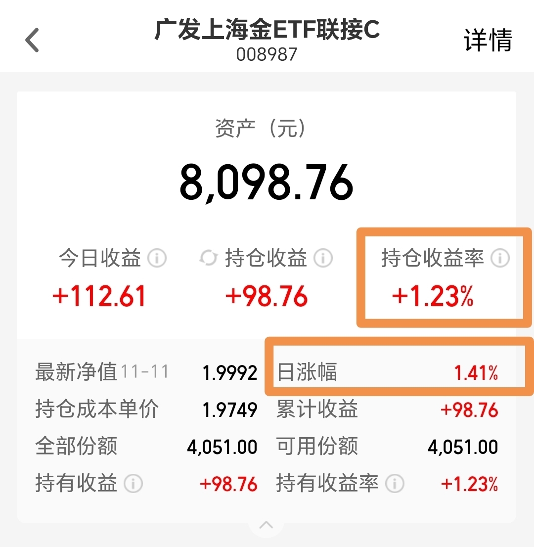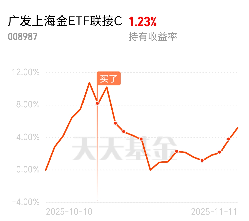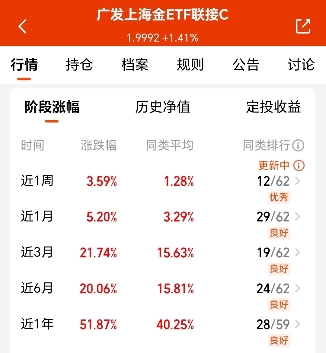 我持仓的$广发上海金ETF联接C$ 收涨1.41%,我今天收益翻红了,已经盈利1.23%了。它近1个月涨5.2%,近3个月涨21.74%,近6个月涨20.06%,近1年涨51.87%,这个收益率还很给力的。