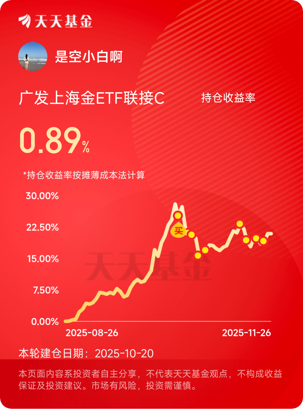 $广发上海金ETF联接C$ 上海金长期涨势稳得很:全球央行疯狂买金,中国央行连续增持,美元信用走弱,美联储还可能降息,这些都给金价托底;而且金矿增产难,供给压不住需求,长期看多逻辑超硬。收益也很能打,基金业绩表现优秀,关键投资超方便,场外联接基金1元就能投,不用扛实物金,还规避汇率风险,香喷喷!#晒收益#