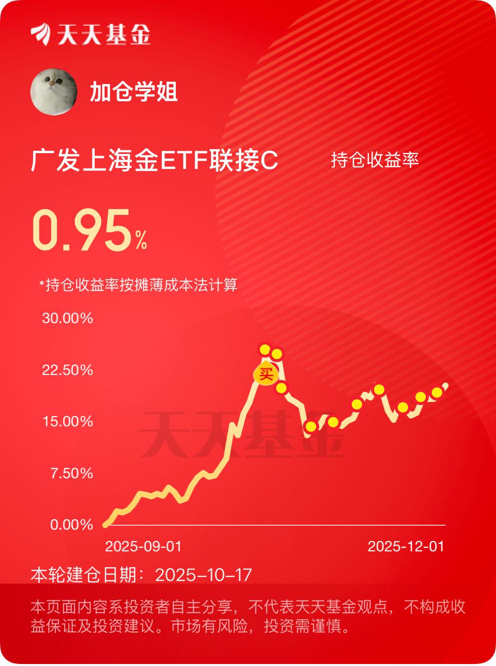 #晒收益# 黄金多金,今天上海金涨超1%,我定投的这只$广发上海金ETF联接C$ 爆蛋102个,开始金生金啦,华尔街大咖说明年上5000美元,我很期待