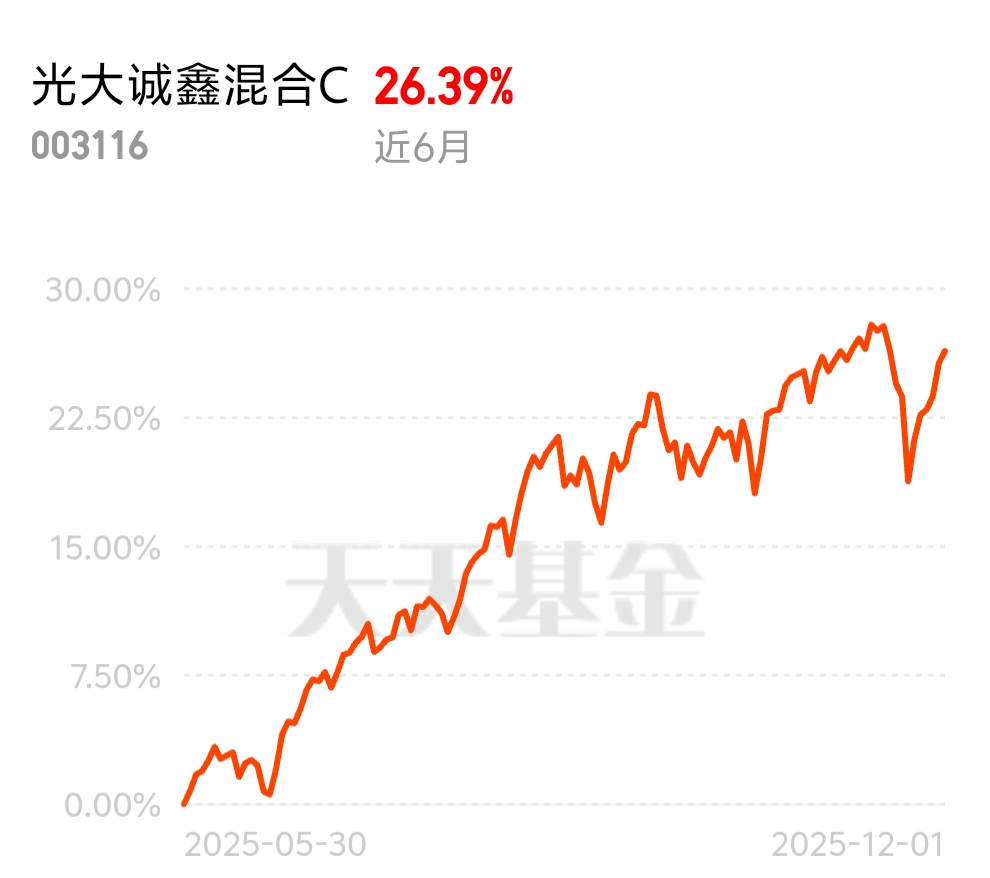 证券板块跟着市场回暖估值修复,IPO 和并购重组活跃,行业景气度持续上行。光大诚鑫混合 C 近 6 个月涨 26.39%,配置优质券商标的,乘上修复东风,收益稳稳往上走。