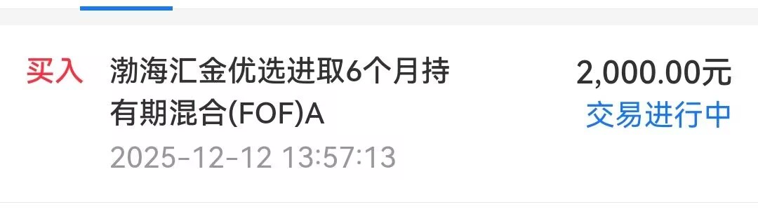 4、$渤海汇金优选进取6个月持有混合发起(FOF)A(OTCFUND|018674)$,买入2000元