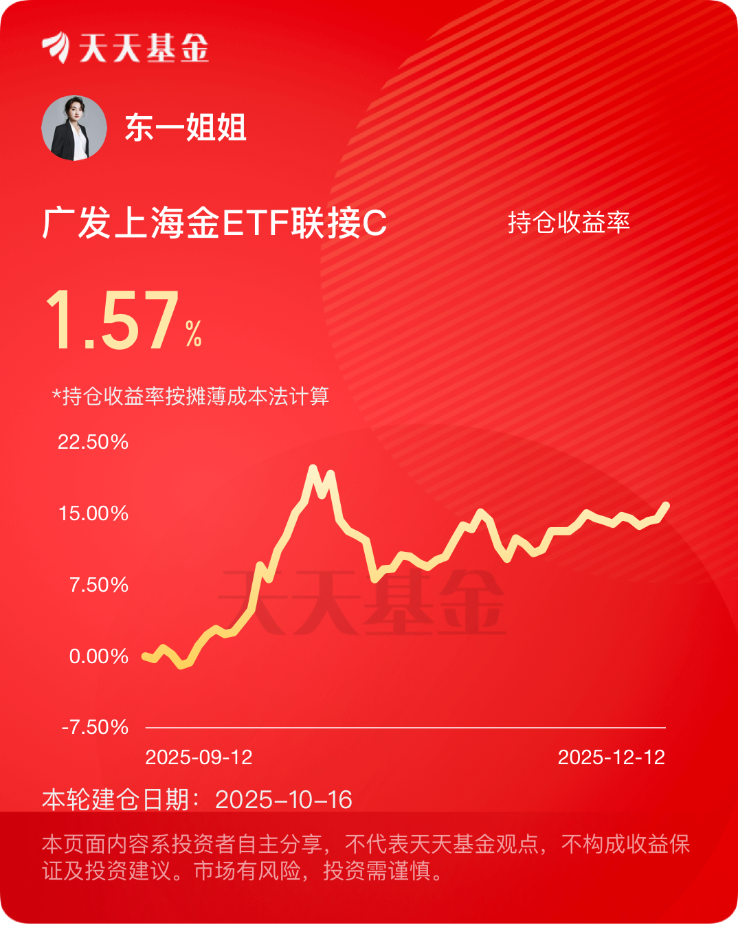 我持有的$广发上海金ETF联接C$ 基金今晚再次大涨1.25%,我又要妥妥的吃肉了!现在美联储年内第三次降息落地,美国就业数据拉胯得不行,市场直接开启撒钱模式;高盛更是预测2026年能冲到4900美元;更狠的是全球央行还在疯狂囤黄金,我要继续跟着央妈买黄金。下周有回调的机会的话,继续做大做强啊!#晒收益#