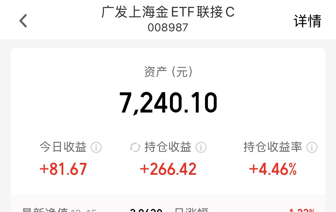我布局的$广发上海金ETF联接C$ 今天上涨1.33%,当前我持有收益率4.46%,弹性杠杠的!