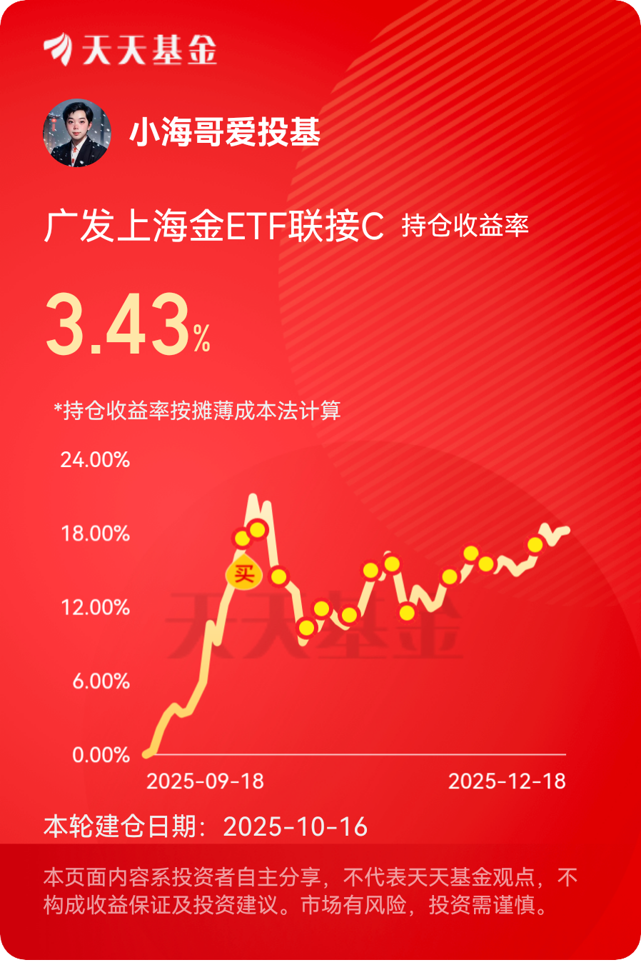 我持有的$广发上海金ETF联接C$ (008987)目前持有收益率超过3%,接下来我还会看情况再拿些筹码,看好黄金中长期表现。