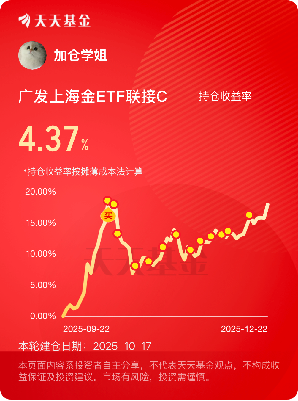 #晒收益# 今天现货黄金又创新高了,距离上次创新高才过了2个月左右,黄金果然多金,$广发上海金ETF联接C$ 这波从前面一路低吸来,没选错