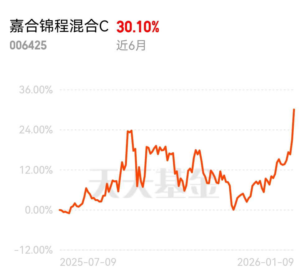 低轨卫星互联网批量发射,5 万多颗卫星要上天,商业航天需求爆发。嘉合锦程混合 C 抓准这个机会,上周五 8 个点到手,今天看着 8 个点起步,近 6 月 30.10%,收益跟着需求涨。$嘉合锦程混合C$