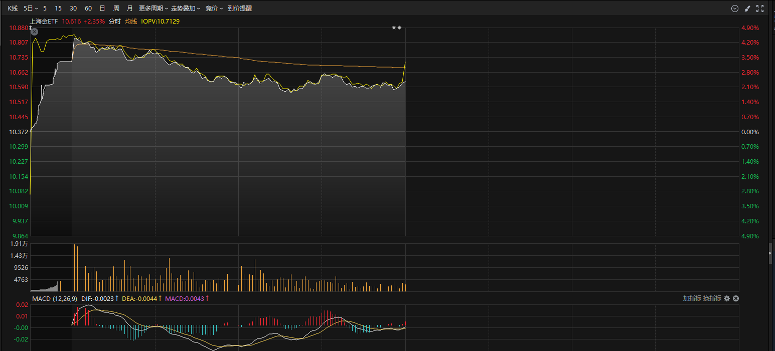 回调了这么多,今天国际金价终于有着回稳迹象了,盘中一度站上4800美元,而紧密跟踪国内黄金市场的上海金ETF(518600)也随之大幅高开。