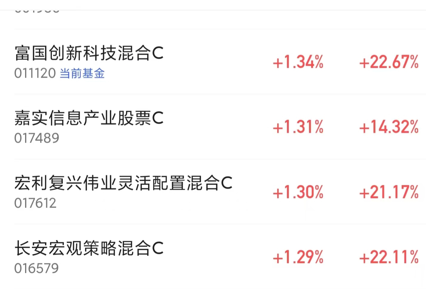 $富国创新科技混合C$ 今天估值1.34%,$嘉实信息产业股票发起式C$ 1.31%,$宏利复兴混合C$ 估值1.3%,$长安宏观策略混合C$ 今天1.29%,又是收获的一天