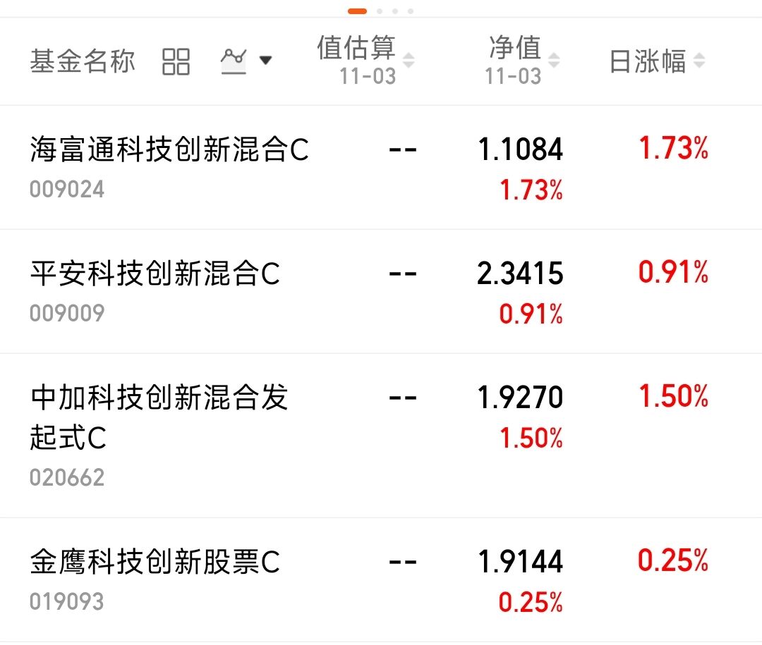 科技起来,午后指数和板块一起拉升,三大股指都收了上涨的光头小阳线。全天震幅特别大,尤其是创业板,从大跌超 2% 到收盘涨 0.29%,震幅达 2.46%。科技类基金继续表现,$海富通科技创新混合C(OTCFUND|009024)$上涨1.73%,$平安科技创新混合C(OTCFUND|009009)$有港股属性,上涨0.91%,$中加科技创新混合发起式C(OTCFUND|020662)$上涨1.5%,$金鹰科技创新股票C(OTCFUND|019093)$上涨0.25%。