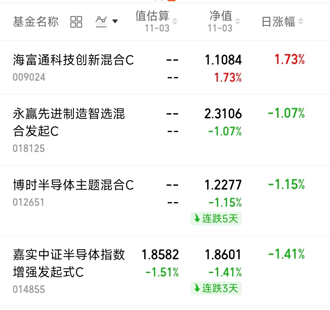 今天盘中不少抱团股有反弹,像易中天、工业富联;但也有在跌的,比如寒武纪、中芯国际,抱团内部明显分化。这两天反弹的题材股分化也大,主要是传统板块在涨,科技题材则涨跌不一。$海富通科技创新混合C(OTCFUND|009024)$上涨1.73%,$永赢先进制造智选混合发起C(OTCFUND|018125)$下跌1.07%,$博时半导体主题混合C(OTCFUND|012651)$下跌1.15%,$嘉实中证半导体指数增强发起式C(OTCFUND|014855)$下跌1.41%。