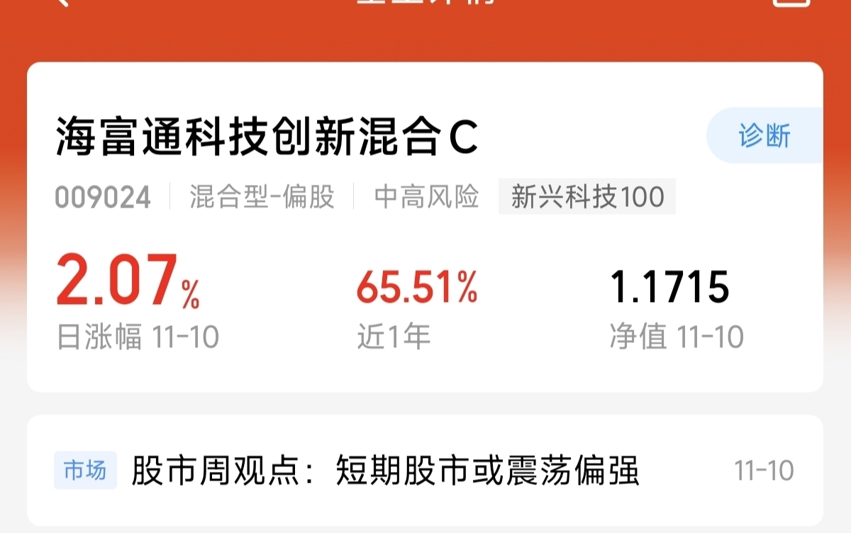 这也太强了吧。今天的科技整体还是回调的$海富通科技创新混合C$ 这次主动的混合基金,又是做到了逆市上涨2.07%,不得不说真的太强了。近一年涨幅65.51%。又是三天连涨,这稳定性太给力了呀,