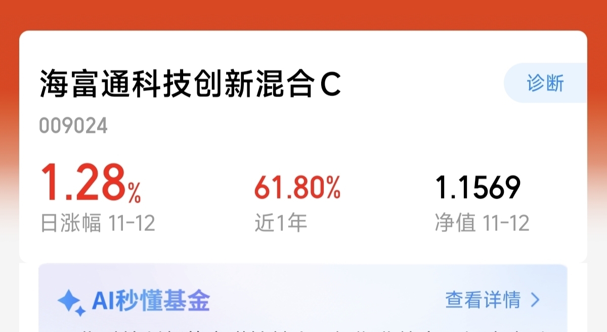 今天的科技大黑马出来了。科技今天出现了回落。但是$海富通科技创新混合C$ 这只主动的科技混合基金。还逆势上涨1.28%。近一年涨幅61.8%。基金经理再次做到了一个精准调仓。期待四季度能继续创新高!