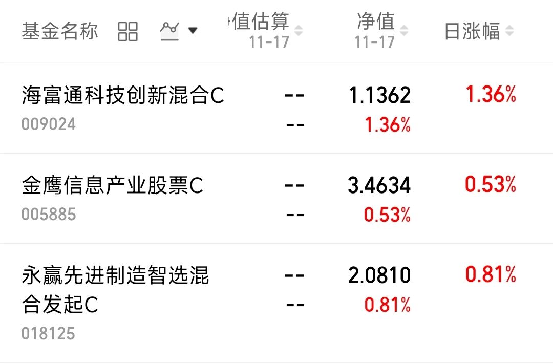 今天的科技虽然有所表现,但是还是以小盘反弹为主,科技的持续性需要大盘的拖动,目前来说能够有持续性的基金,今晚表现都很不错,$海富通科技创新混合C(OTCFUND|009024)$上涨1.36%,$金鹰信息产业股票C(OTCFUND|005885)$上涨0.53%,$永赢先进制造智选混合发起C(OTCFUND|018125)$上涨0.81%。