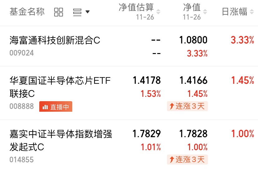 行情虽然说出现了部分科技的上涨,但整体还是让人摸不清方向的,科技类基金也是各自为战。$海富通科技创新混合C(OTCFUND|009024)$今天上涨3.33%,$华夏国证半导体芯片ETF联接C(OTCFUND|008888)$上涨1.45%,$嘉实中证半导体指数增强发起式C(OTCFUND|014855)$上涨1%。