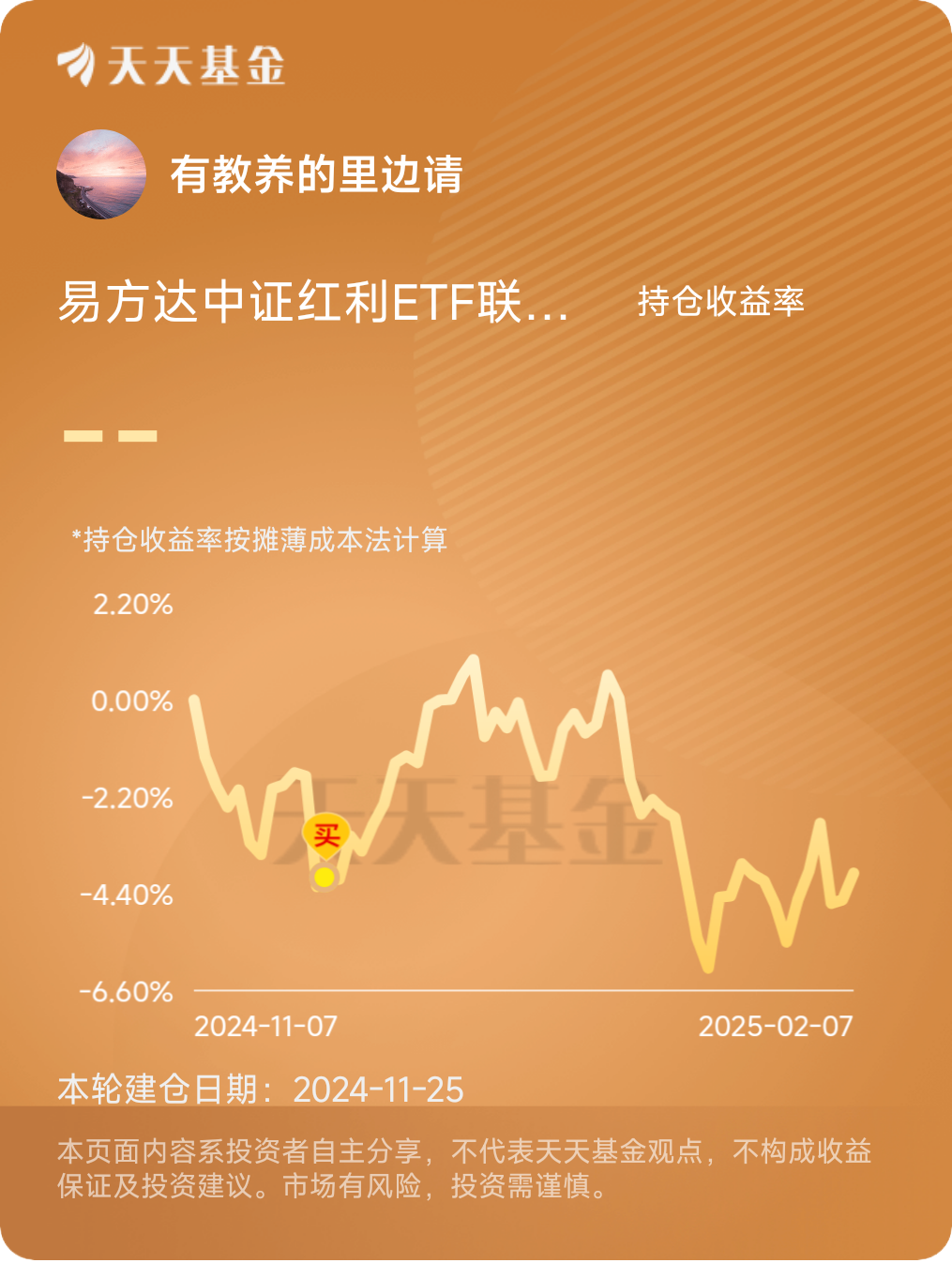 中证红利有点小绿,不过我觉得这是正常波动。长期看,中证红利在农副食品加工和新能源这些领域表现不错,这些行业的前景挺好,长远看应该能带来不错的回报。理财,还是要有点耐心的,我继续持有,看看能不能熬出头。#晒收益#