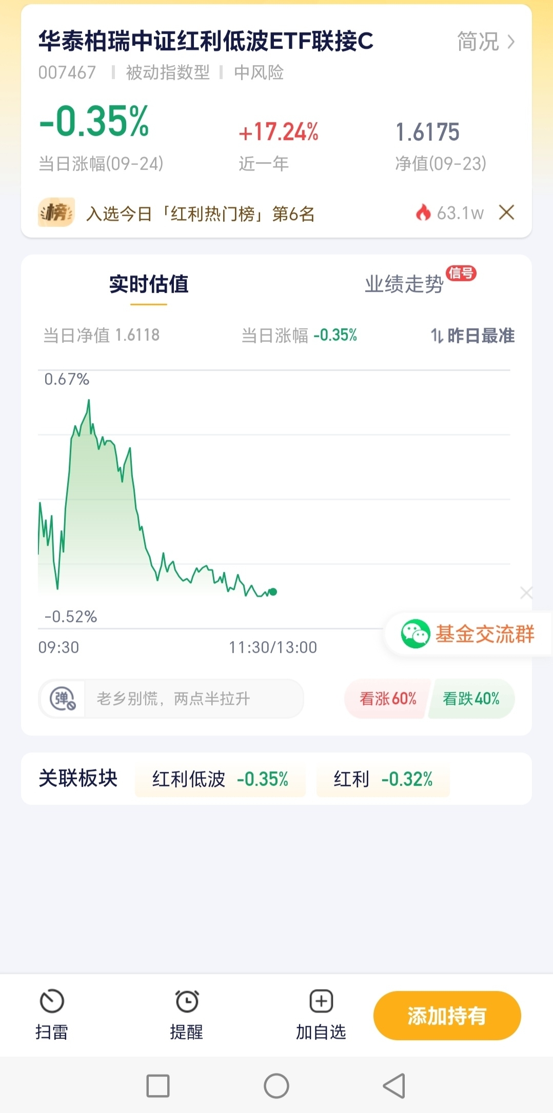 关注红利低波的朋友看过来,华泰柏瑞近一年涨17.24%,今天进了红利热门榜!最近市场波动,科技板块起起伏伏,红利板块调整后是参与好时机,美联储大概率继续降息,利率下行、股息率回升,科技+红利配置可攻可守。想布局的,华泰柏瑞值得考虑,潜力没谁了!