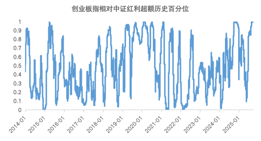 从我们跟踪的数据来看,当前创业板指与中证红利的3个月收益差,已处于历史99.6%的分位水平,接近有数据以来的最高区间。这说明,当前的市场风格分化,已进入一个相对极致的状态。