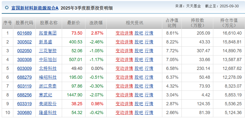 以富国新材料新能源混合A为例,最新的季报显示,股票仓位占比91.98%,前十大重仓占比近六成,持股集中度较高。从换手率来看,整体不算高。