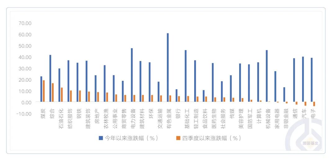 行业层面,申万一级行业数据显示,今年以来有色金属以61.20%的涨幅一骑绝尘,电力设备、基础化工、机械设备紧随其后,涨幅均超46%,共同构成“制造业升级”与“能源转型”双主线。而四季度以来,市场风格明显切换,煤炭(+19.29%)、石油石化(+12.85%)、钢铁(+10.20%)等周期板块领涨,通信(-2.14%)、电子(-3.60%)等科技领域则暂入调整。