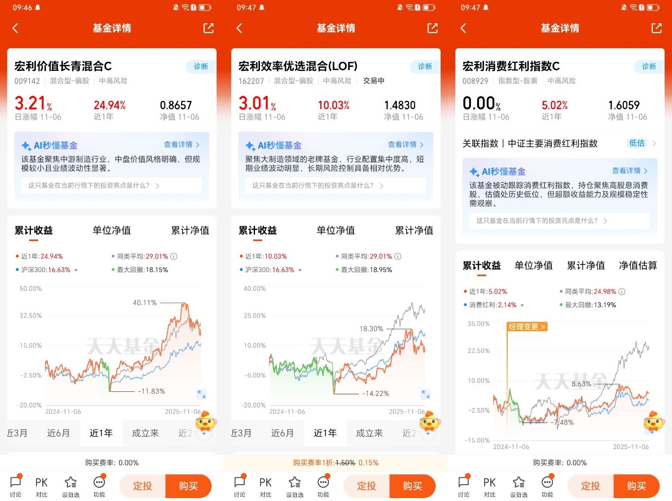 今天是我加入"养基计划"的第二天,我把宏利价值长青混合C、宏利效率优选混合(LOF)、宏利消费红利指数C都加入了自选,就像给未来的自己准备了一份"财务安全感"。看着这几只基金的走势,我在想:消费行业的韧性其实很强,毕竟人们对美好生活的追求不会停,这也是我选择关注消费红利指数的原因。
