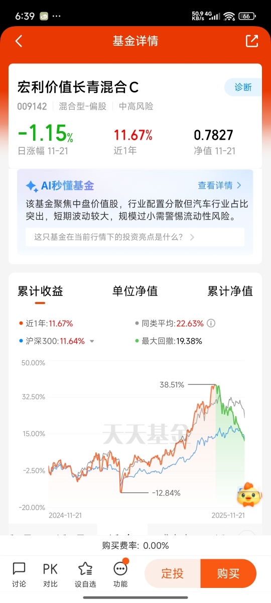 打开宏利价值长青混合C(009142)的最新净值,截至2025年11月23日,单位净值为0.7827元,基金规模仅剩961.24万元。这只运行了5年5个月的基金,自成立以来年化收益率为-4.42%,任期回报为-21.73%。