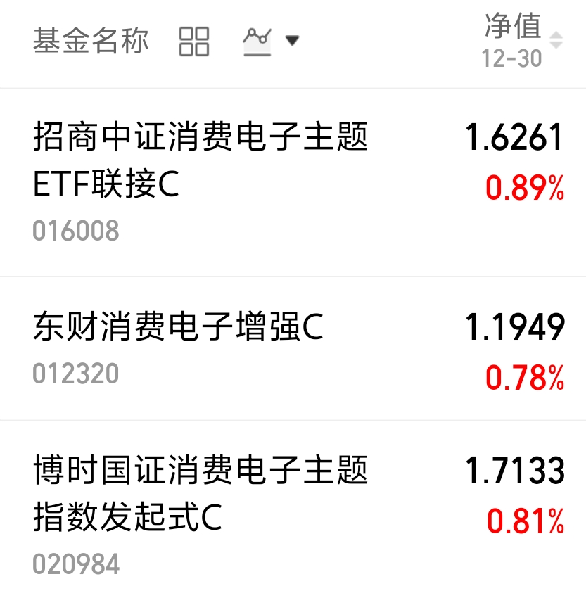 大盘昨天拉升上涨,三大指数低开高走,消费电子板块昨天表现还不错,$招商中证消费电子主题ETF联接C$ 昨天涨了0.89%,表现不错呢!