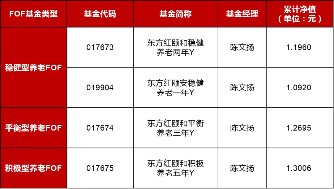 风险提示:“养老”名称不代表收益保障或任何形式的收益承诺,养老基金不保本,也不保证最低收益。Y类基金份额仅供个人养老金客户申购。投资个人养老基金时,基金份额赎回等款项将转入个人养老金资金账户,投资人未达到领取基本养老金年龄或者政策规定的其他领取条件时不可领取个人养老金。上述养老FOF基金的基金份额均设置锁定持有期(由红利再投资而来的基金份额不受锁定持有期的限制),投资者面临在锁定持有期内不能赎回及转换转出基金份额。基金投资需谨慎,敬请投资者注意投资风险。基金的过往业绩及其净值高低并不预示未来业绩表现,基金管理人管理的其他基金的业绩不构成对上述基金业绩表现的保证。基金管理人承诺以诚实守信、勤勉尽责的原则管理和运用基金资产,但不保证一定盈利,也不保证最低收益。基金投资有风险,投资需谨慎。投资者投资基金前,请认真阅读《基金合同》、《招募说明书》、《基金产品资料概要》等文件。如需购买相关基金产品,请您关注投资者适当性管理相关规定、提前做好风险测评,并根据您自身的风险承受能力购买与之相匹配的风险等级的基金产品。上述基金由上海东方证券资产管理有限公司发行与管理,代销机构不承担产品的投资和兑付责任。