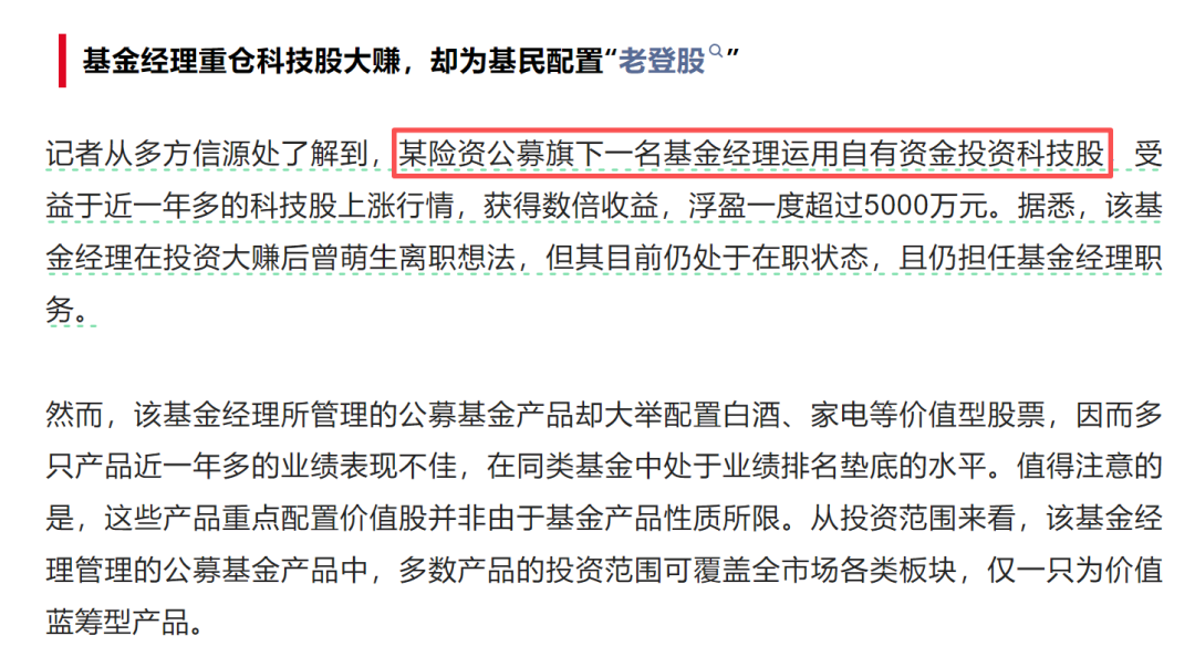 昨天,财联社一则关于《基金经理自己重仓科技股大赚,却为基民配置“老登股”》的报道,引发基民投资者的广泛关注与讨论。
