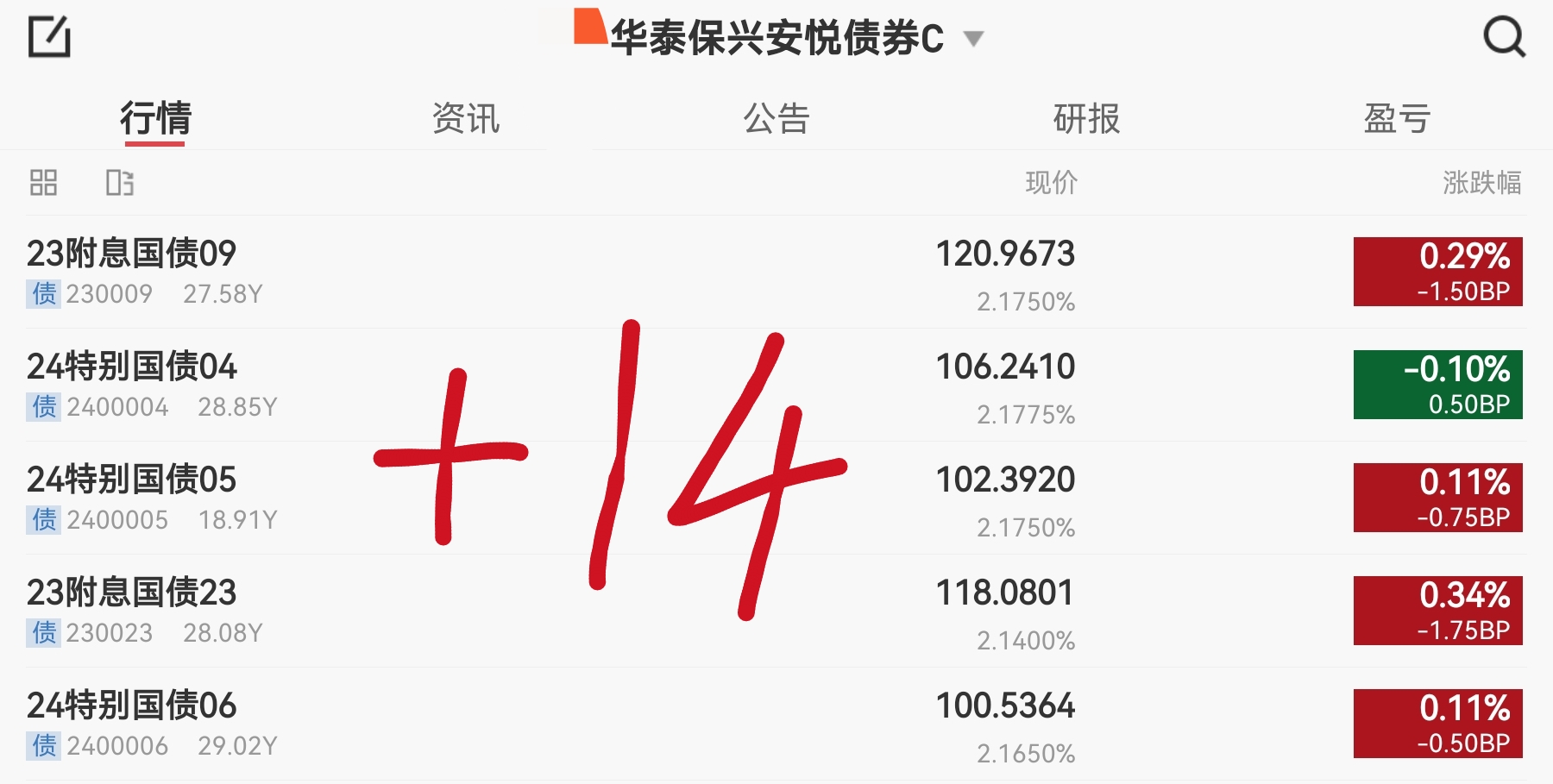 下午盘中利率债出现了一波快速拉升,不仅拉升速度快,而且拉升幅度也很大。所以华泰保兴安悦债券C直接由绿转红,收14个蛋。