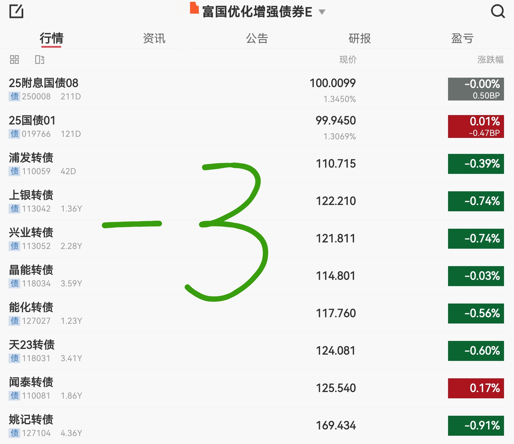 权益市场和可转债市场都在拉升。从富国优化持仓的个股个券表现来看,持仓股票表现还不错,可转债也在慢慢好转,所以它的跌幅在明显缩窄。富国优化增强债券E丢3个蛋。