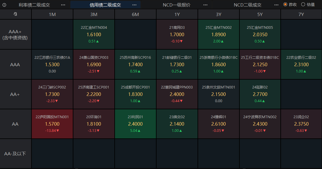 信用债行情也有一定程度好转,短端城投债快速回升;长端银行债也有起色。从整体盘面来看,信用债以涨跌互现行情为主。