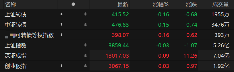 下午盘中权益市场震荡上行,目前创业板指和深证成指已经上涨翻红。可转债也在不断拉升,目前可转债等权指数已经翻红,上证转债和中证转债指数跌幅大幅缩窄。利率债价格快速拉升,收益率快速下行,目前中长端债券多数上涨翻红。信用债行情也有一定程度好转。