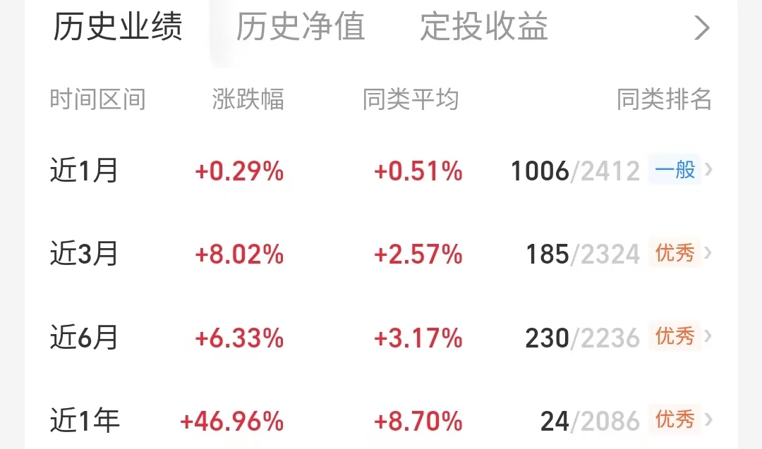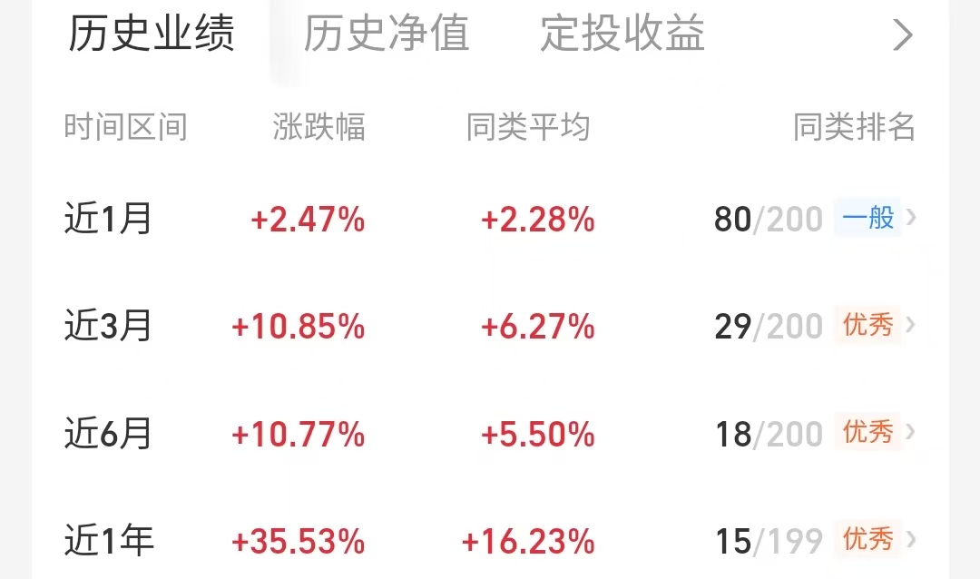 该基金是一只混合型基金,主打均衡策略,所以投资标的以债券为主,占57.83%;以股票为辅,占39.02%;没有可转债持仓。持仓股票主要分布于科技、制造、医药、消费等领域,从持仓上来看,基本上算是一支中高波混债基金了。所以业绩表现还是比较强的,近一个月收益率达到了2.47%,近三个月收益率达到了10.85%,近六个月收益率达到了10.77%,近一年收益率更是高达35.53%。由于最近权益市场有一定程度调整,所以该混债基金出现了一定程度的回撤,本轮调整最大回撤-3.11%,目前回撤还在修复中,所以今天趁着低位买一笔,静待后市上涨。
