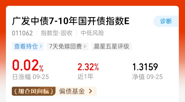 今天收2蛋,虽然不多,但终于开始反弹了,希望能持续!广发7-10年为老牌绩优利率债基,主投国开债,进攻性强。上市以来21个季度荣获晨星5星评级,连续7年实现正收益,能涨抗跌,调整后修复速度快,净值屡创新高。近1年涨幅达2.32%。
