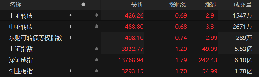 可转债几乎没有受到权益市场回落影响,当前可转债三大指数涨幅依然保持在0.65%以上。