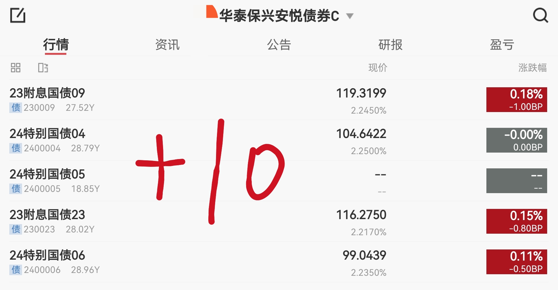 $华泰保兴安悦债券C(OTCFUND|020741)$$国金惠盈纯债C(OTCFUND|006760)$$富国久利稳健配置混合E(OTCFUND|019370)$$富国优化增强债券E(OTCFUND|018980)$$方正富邦鸿远债券C(OTCFUND|015909)$$南方中债7-10年国开行债券指数E(OTCFUND|013594)$$国泰嘉睿纯债债券C(OTCFUND|016604)$