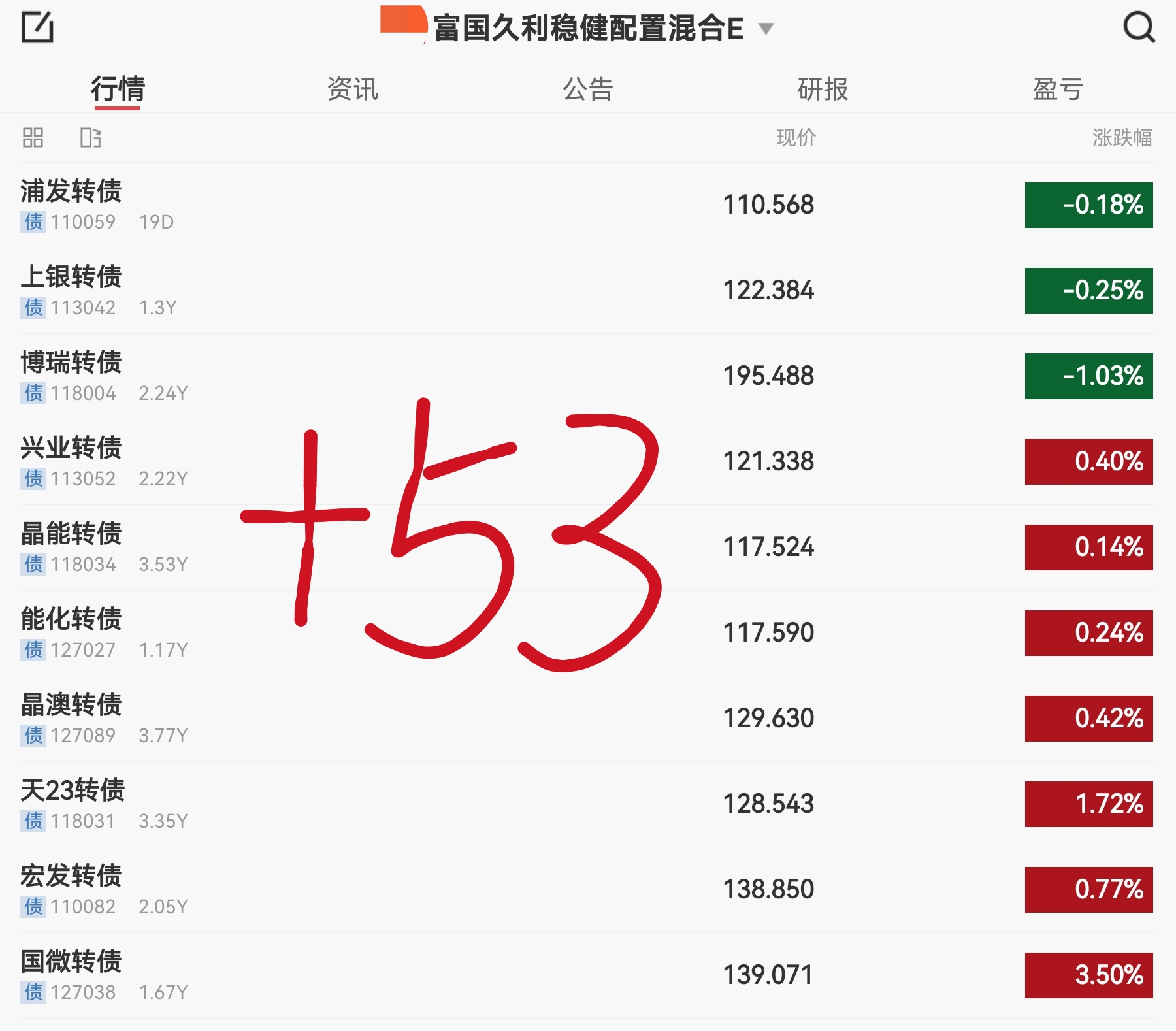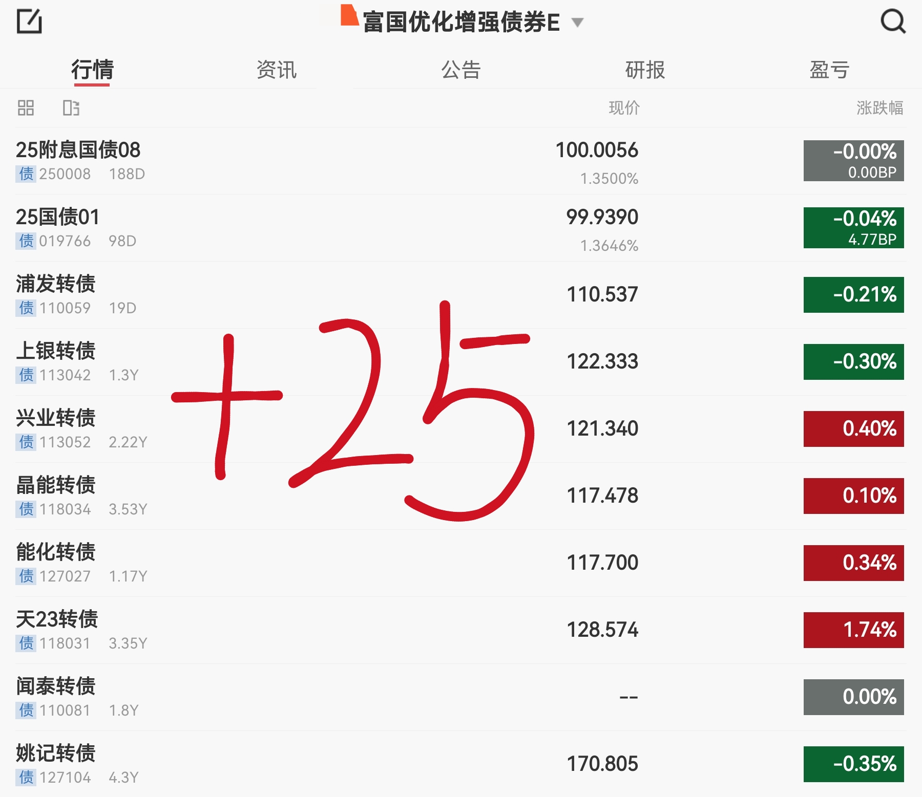下午盘中权益市场出现了比较明显的回落,但是可转债支撑还是比较明显的回落不明显。目前富国优化增强债券E涨幅也明显缩窄,目前收25个蛋15。